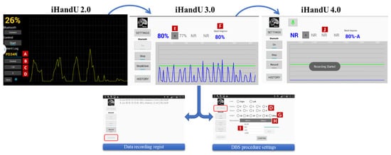 Evolution of the iHandU Android application. All applications were developed to receive the MoMo data and processes it in real time, as well as to record important DBS-related information, using a user-friendly interface. In the iHandU 2.0, the user was able to record the patient ID (A), the anatomical place of stimulation (B), the voltage of stimulation (C) and the rigidity UPDRS (D); the iHandU 3.0, in addition to recording the previous information, also made it possible to collect other relevant information, such as the depth (G) and type of stimulation, the examiner’s name, the tremor UPDRS (D) and the number of cogwheel rigidity artefacts (E). This interface also included a history of stimulations button and the best result was exhibit in the main windows (F). From then on, all data coming from the three axes of the gyroscope and accelerometer sensors were stored in our database. Recently, the iHandU 3.0 was complemented with the voice recording button (J), allowing the recording of all information related with the DBS procedure. This version (iHandU 4.0) is currently being used.