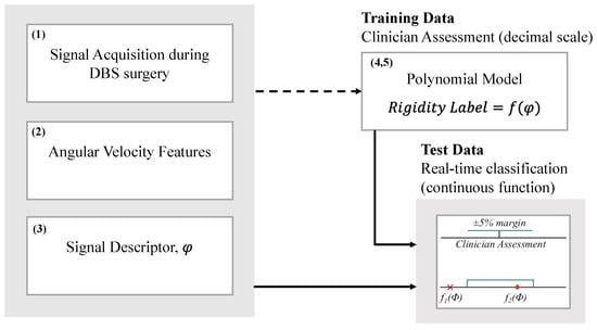 So far, four iHandU system versions have been developed. In all versions, a rigidity classification model has been developed to assess the wrist rigidity reduction during the DBS procedure, which all of them shared a similar framework of rigidity classification (Figure 6). This framework comprises the following steps: (1) signal is acquired during the DBS surgery for a group of patients, i.e., the training set; (2) features are extracted from the signal, reflecting different rigidity levels; (3) all features are combined in one function, designated as signal descriptor; (4) the average values of the signal descriptors belonging to the same medical label classes of rigidity improvement, ranging from 0 to 80%, are computed; (5) the second-order polynomial function that best model the relationship between the percentage of rigidity improvement (Rigidity Label) and the signal descriptor is estimated; (6) the previous function is used to classify the rigidity improvement of a second group of patients during the DBS surgery, i.e., the test set. A classification is considered accurate if it is within a range of 5% away from the clinician’s classification.