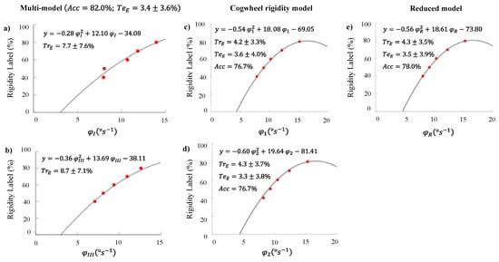 Polynomial models tested during DBS surgery: (a) Low baseline rigidity of Multi-model considering the signal descriptor ; (b) High baseline rigidity of Multi-model considering the signal descriptor ; (c) Cogwheel rigidity model considering the signal descriptor ; (d) Cogwheel rigidity model considering the signal descriptor ; (e) Reduced model. Adapted from [15,19].
