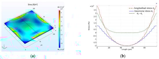 The stress distribution of silicon thin films is analyzed in detail with the finite element analysis, and the result is shown in Figure 2a. Along the centerline of the diaphragm, the tensile stress at the center of the membrane edge reaches its maximum. Then after a parabolic trend, another maximum value emerges in the center of the diaphragm, which is the compressive stress. However, as can be seen from the stress curve in Figure 2b, the orthogonal stress difference at the center is zero. Therefore, the piezoresistor should be placed at the center of the edge of the diaphragm.