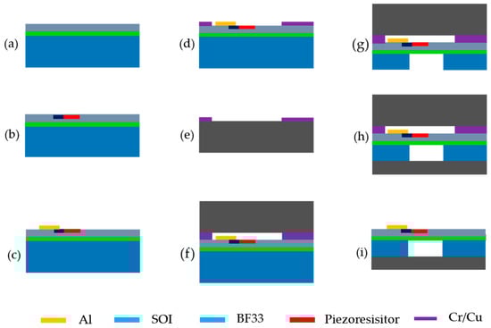 Manufacturing process of the proposed pressure sensor (a) SOI wafer, (b) ion impantation, (c) the electrode preparation, (d) sputtering deposition, (e) BF33 wafer, (f) bonding, (g) CMP and erching, (h) bonding and polishing, (i) dicing and separating.