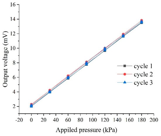 The I–V tests has been performed with a Semiconductor Device Parameter Analyzer (Keysight B1500, Aglient, Palo Alto, CA, USA). The resistance value of piezoresistors and reference resistors are between 1.8–2.2 kΩ, which are very close to the design value of 2.1 kΩ. When a constant current source of 1mA is applied, multiple cycle tests on the pressure sensor have been carried out. In the pressure range of 0–180 kPa, a sensitivity of 36 μV/(V∙kPa) is obtained at room temperature. Figure 6 shows three sets of data for circular journey at 25 °C.
