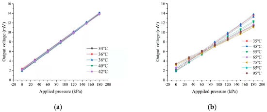 To characterize the output performances with temperature, the pressure sensors are tested by mounting them. As shown in Figure 7a, the sensitivity is still maintained at around 36 μV/(V∙kPa) in the temperature range of the human body (34–42 °C). In the temperature range of 25–95 °C, although the chip still exhibits good linearity, the sensitivity gradually decreases with the increase of temperature, as illustrated in Figure 7b.