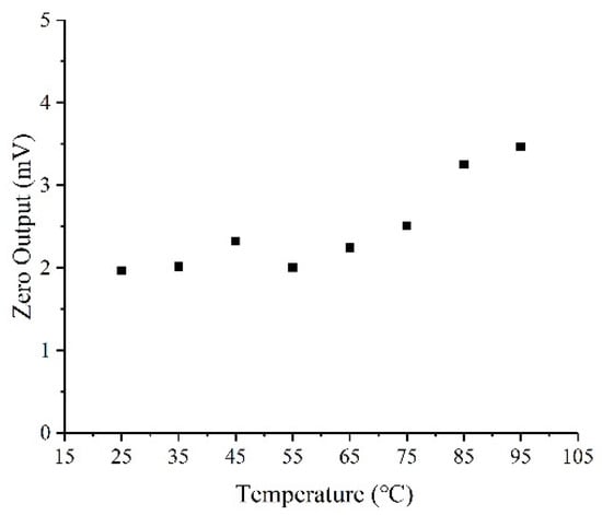 At the same time, from Figure 8, the zero output drifts at different temperatures. The reason for this result is that, as temperature increases, the gas generated during anodic bonding will expand, causing a change in the resistance on the membrane. In addition, due to the half-bridge design without the temperature compensation circuit, the temperature drift will be relatively obvious. Table 1 lists the performance of the miniature pressure sensor. The test results show that the chip has acceptable performance in terms of sensitivity, linearity, repeatability, and hysteresis. In addition, in the temperature range of 34 to 42 °C, the temperature coefficient of sensitivity (TCS) and the temperature coefficient of zero offset (TCO) are 1.03 × 10−3 FSO/°C and 8.11 × 10−4 FSO/°C respectively, indicating the good temperature characteristics.