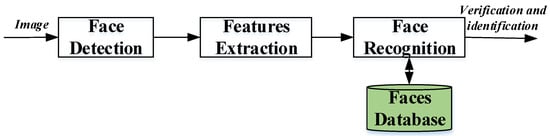 Three basic steps are used to develop a robust face recognition system: (1) face detection, (2) feature extraction, and (3) face recognition (shown in Figure 1) [3,23]. The face detection step is used to detect and locate the human face image obtained by the system. The feature extraction step is employed to extract the feature vectors for any human face located in the first step. Finally, the face recognition step includes the features extracted from the human face in order to compare it with all template face databases to decide the human face identity.