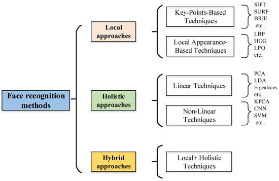 Holistic or subspace approaches are supposed to process the whole face, that is, they do not require extracting face regions or features points (eyes, mouth, noses, and so on). The main function of these approaches is to represent the face image by a matrix of pixels, and this matrix is often converted into feature vectors to facilitate their treatment. After that, these feature vectors are implemented in low dimensional space. However, holistic or subspace techniques are sensitive to variations (facial expressions, illumination, and poses), and these advantages make these approaches widely used. Moreover, these approaches can be divided into categories, including linear and non-linear techniques, based on the method used to represent the subspace.
