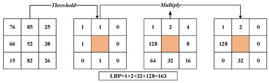 - Local binary pattern (LBP) and it’s variant: LBP is a great general texture technique used to extract features from any object [16]. It has widely performed in many applications such as face recognition [3], facial expression recognition, texture segmentation, and texture classification. The LBP technique first divides the facial image into spatial arrays. Next, within each array square, a pixel matrix ) is mapped across the square. The pixel of this matrix is a threshold with the value of the center pixel (i.e., use the intensity value of the center pixel as a reference for thresholding) to produce the binary code. If a neighbor pixel’s value is lower than the center pixel value, it is given a zero; otherwise, it is given one. The binary code contains information about the local texture. Finally, for each array square, a histogram of these codes is built, and the histograms are concatenated to form the feature vector. The LBP is defined in a matrix of size 3 × 3, as shown in Equation (1).where and are the intensity value of the center pixel and neighborhood pixels, respectively. Figure 3 illustrates the procedure of the LBP technique.