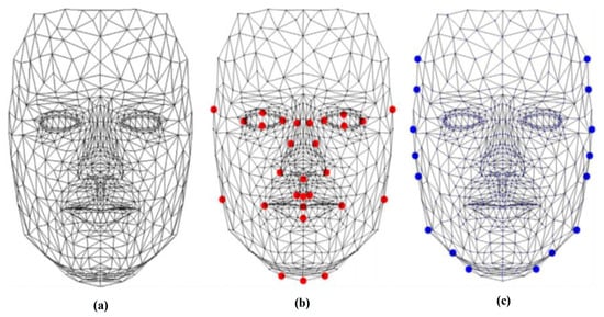 Figure 6. (a) Creation of the 3D face of a person, (b) results of the detection of 29 landmarks of a face using the active shape model, (c) results of the detection of 26 landmarks of a face [3].