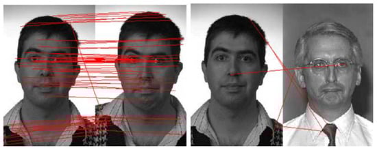 Figure 7. Face recognition based on the speeded-up robust features (SURF) descriptor [58]: recognition using fast library for approximate nearest neighbors (FLANN) distance. - Binary robust independent elementary features (BRIEF) [30,57]: BRIEF is a binary descriptor that is simple and fast to compute. This descriptor is based on the differences between the pixel intensity that are similar to the family of binary descriptors such as binary robust invariant scalable (BRISK) and fast retina keypoint (FREAK) in terms of evaluation. To reduce noise, the BRIEF descriptor smoothens the image patches. After that, the differences between the pixel intensity are used to represent the descriptor. This descriptor has achieved the best performance and accuracy in pattern recognition.