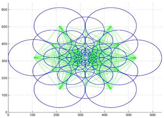 - Fast retina keypoint (FREAK) [57,59]: the FREAK descriptor proposed by Alahi et al. [59] uses a retinal sampling circular grid. This descriptor uses 43 sampling patterns based on retinal receptive fields that are shown in Figure 8. To extract a binary descriptor, these 43 receptive fields are sampled by decreasing factors as the distance from the thousand potential pairs to a patch’s center yields. Each pair is smoothed with Gaussian functions. Finally, the binary descriptors are represented by setting a threshold and considering the sign of differences between pairs.