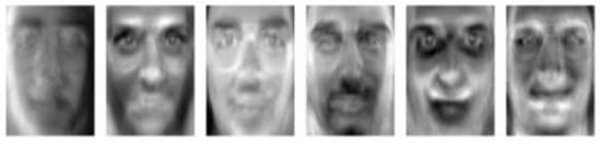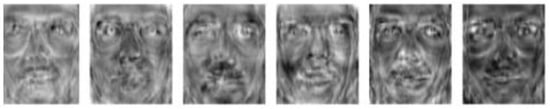 Figure 10. The first five Eigenfaces built from the ORL database [63].An image may also be considering the vector of dimension , so that a typical image of size 4 × 4 becomes a vector of dimension 16. Let the training set of images be . The average face of the set is defined by the following:Calculate the estimate covariance matrix to represent the scatter degree of all feature vectors related to the average vector. The covariance matrix is defined by the following:The Eigenvectors and corresponding Eigen-values are computed usingwhere is the set of eigenvectors matrix associated with its eigenvalue . Project all the training images of person to the corresponding Eigen-subspace:where the are the projections of and are called the principal components, also known as eigenfaces. The face images are represented as a linear combination of these vectors’ “principal components”. In order to extract facial features, PCA and LDA are two different feature extraction algorithms that are used. Wavelet fusion and neural networks are applied to classify facial features. The ORL database is used for evaluation. Figure 10 shows the first five Eigenfaces constructed from the ORL database [63]. - Fisherface and linear discriminative analysis (LDA) [64,65]: The Fisherface method is based on the same principle of similarity as the Eigenfaces method. The objective of this method is to reduce the high dimensional image space based on the linear discriminant analysis (LDA) technique instead of the PCA technique. The LDA technique is commonly used for dimensionality reduction and face recognition [66]. PCA is an unsupervised technique, while LDA is a supervised learning technique and uses the data information. For all samples of all classes, the within-class scatter matrix and the between-class scatter matrix are defined as follows:where is the mean vector of samples belonging to class , represents the set of samples belonging to class with being the number image of that class, is the number of distinct classes, and is the number of training samples in class . describes the scatter of features around the overall mean for all face classes and describes the scatter of features around the mean of each face class. The goal is to maximize the ratio |, in other words, minimizing while maximiz . Figure 11 shows the first five Eigenfaces and Fisherfaces obtained from the ORL database [63].