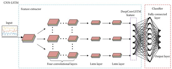 - Convolution operations, LSTM recurrent units, and ELM classifier [103]: Sun et al. [103] propose a hybrid deep structure called CNN–LSTM–ELM in order to achieve sequential human activity recognition (HAR). Their proposed CNN–LSTM–ELM structure is evaluated using the OPPORTUNITY dataset, which contains 46,495 training samples and 9894 testing samples, and each sample is a sequence. The model training and testing runs on a GPU with 1536 cores, 1050 MHz clock speed, and 8 GB RAM. The flowchart of the proposed CNN–LSTM–ELM structure is shown in Figure 13 [103].