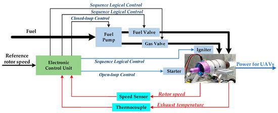 - Start-up control. The engine start-up process can be divided into six parts in our work: (1) Burner on. After the starting operation, the igniter is switched on for preheating, which takes 10 s to fully preheat. (2) Starter on. The starter motor is turned on to rotate the rotor to obtain a lower speed state, which lasts 10 s. (3) Ignition. The gas valve is opened to supply gas or tiny bits of fuel, and the temperature of the combustion chamber rises gradually. A successful ignition is marked by the combustion chamber temperature rising to 90 °C. (4) Preheat. The gas valve and fuel valve are opened alternately, and the fuel supply is increased gradually. When the combustion chamber temperature rises to 150 °C, preheating is completed. (5) Switch-over. The gas valve is closed and the fuel valve is open continuously in this process, so that the engine enters the stable fuel supply stage. (6) Fuel ramp. The fuel supply is increased and the starting motor accelerates so that the engine enters the acceleration process. The starting motor will be shut down when the engine speed reaches the idle speed. During the start-up process, only some logic controls are required. The engine works under the open-loop conditions with limitations on the fuel flow rate.