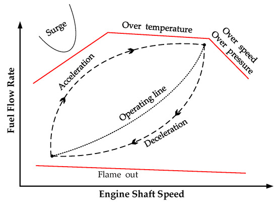 An important consideration in the MTE control system is to ensure the engine does not surge and flame out during acceleration or deceleration. As shown in Figure 5, the MTE should be operated in a limited safe range. The maximum fuel limit protects against a surge and stall, over-temperature, over speed, and overpressure. The minimum fuel limit protects against combustor blowout. In addition, the change rate of the fuel flow has to be limited in acceleration and deceleration boundary. Thus, the engine control should consider the limitation on input.