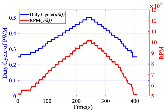 As mentioned in [32], the experimental identification is performed by applying the PWM pulses of 10 kHz with varying duty cycles to the fuel pump. Meanwhile, the revolutions per minute (RPM) of the engine is recorded by the designed ECU. The input signal of the identification is the duty cycle in the continuous step waveform. All steps have the same amplitude, and the corresponding step response is the measured RPM. Figure 8 shows the input duty cycle and rotation speed response of the engine without any control strategy.