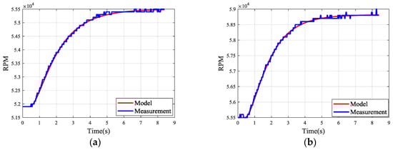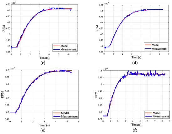 For this reason, within the entire operating speed range, the dynamic behavior of MTE can be approximately described by a set of second-order models. Each model can be identified by using step input and step response measurements corresponding to a specific speed range. We employ the tfest function in MATLAB to estimate the transfer function in Equation (15). Table 2 shows the identified parameters of the engine within the operating range from 51,900 to 70,800 RPM.