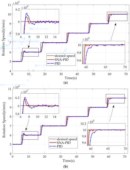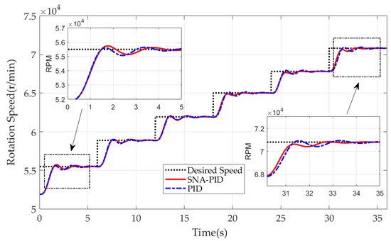 For ease of control performance evaluation, the step responses of the MTE under control are compared in Figure 13. It is clear that the two controllers in two cases show good performance on speed tracking. Due to the strong nonlinearity of MTE at low speed (50,000–60,000 RPM), the obvious overshoots are observed in two cases. In comparison with the PID controller, the SNA-PID controller shows better tracking performance. It yields smaller overshoots and faster decay. Furthermore, with the growth of speed, the benefit of the SNA-PID controller is becoming increasingly apparent. The rising time as well as the overshoot are gradually reduced by the SNA-PID controller. Besides, it is worth noting that the SNA-PID controller also brings a great reduction in static error. This implies that the proposed control system is able to provide a more stable thrust force than the traditional system at the desired operating speed.
