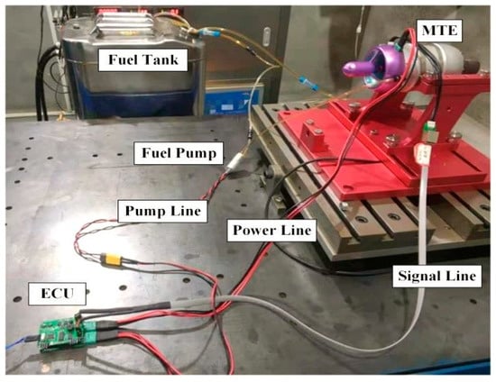Experiments are carried out for control performance evaluation. The experimental setup is shown in Figure 11. The MTE named NT-50A is employed in our experiment with a fixed exhaust nozzle. The MTE is fixed on the test bench and is connected with ECU by signal and power lines. The electric fuel pump (ZP25M14F, HP-Tech, GmbH, Maria Buch-Feistritz Austria) absorbs light diesel oil from the fuel tank and provides it to the engine. The environmental temperature is 35 °C.
