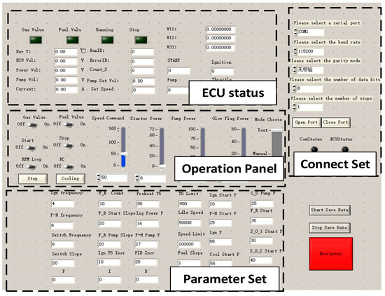 The ECU equipped with a microprocessor (STM32F103C8T6, STMicroelectronics) works as the intermediate managing the communication between the host computer and MTE, as well as the controller. STM32 is a 32-bit microcontroller based on ARM core. It has rich ports for easy connections with diverse sensors. Due to the high performance and low cost, STM32 is one of the essential controllers in the industry field. We use STM32 herein as the main control chip for algorithm implementation. The temperature and rotor speed are acquired by the internal ADC of microprocessors with a sampling frequency of 50 Hz. Meanwhile, the ECU sends the sampling data to the host PC via a serial port. For ease of communication, a user interface based on LabWindows/CVI platform has been developed on the host PC. The designed user interface is shown in Figure 12. It is used to send reference speed commands to the ECU and to receive the engine status from the ECU. In this way, the engine operation can be monitored by on-screen displays, and the operation of the engine can be timely stopped in urgent circumstances. In our experiments, the interface helps us record the testing data to hard disk synchronously for subsequent analysis.