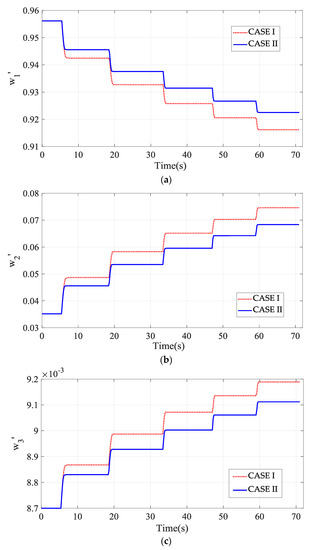 For easy understanding of the self-learning ability of the SNA-PID controller, the recorded time histories of three weights in Equation (13) are plotted in Figure 15. All the weights adapt to the variation of the desired speed and have great changes at each instant of speed transition. Once the actual speed reaches the desired value, the weights of the SNA-PID controller will stop the update. On the other side, Figure 15 also illustrates that the limitations on have great impacts on the weights, especially at the low-speed range. In comparison with Case II, the limits in Case I pose stricter constraints on flow rate regulation, thus larger variations of weights are generated by the SNA-PID controller to remedy the control deficiency. Unfortunately, the larger variations may induce larger tracking error, particularly static error as demonstrated in Figure 14. On the contrary, the relaxed limits in Case II provide sufficient control capability. It allows the controller to update the weights with the smaller variations. It is worth noting that the variations of weights in both cases get smaller and smaller because of the adaptive regulation of the SNA-PID controller.
