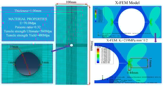 The specimens for the target system were made of a 7075-T6 aluminum alloy, which is widely used in aircraft and the mechanical peripeties, shown in Figure 1. The specimens with dimensions of 300 × 100 × 1 mm, a 10 mm center hole and a 1 mm through-thickness pre-crack were processed by electric-discharge machining (EMD) to promote fatigue crack initiation.