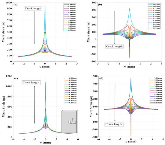 For an ideal crack, in the εyy plots, the strain filed corresponded with the pre-crack tip, shown in Figure 2. When the FBG sensor was at a distance from the crack tip, it sensed elastic behavior. When a fatigue crack grew under several fatigue loading cycles, the crack path gradually became straight, although the initial crack had a tortuous shape. As crack propagation approached near the FBG sensors, the strains gradually accumulated in the tensile direction with strain concentrations, strain gradients, and multiple strain components along the fiber. A symmetrical plastic zone was expected near the crack tip at both sides of the crack line, and the grating sensing a large quadratic strain. However, for real fatigue cracks, the fiber behind the crack tip senses the residual compressive strains εyy, which exist as a significant portion of the strain composition in the crack wake. According to previous studies on the mechanisms for fatigue crack closure and the mechanisms under plane strain [20], it was reported that the residual strain in the crack wake under plane strain from contraction of the material in the crack propagation direction would help the crack closure.