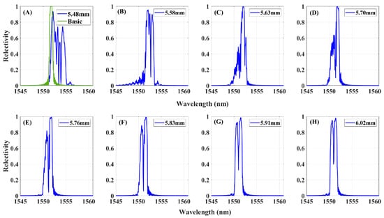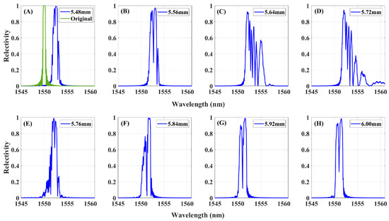 Simulated reflected spectra in subfigures (A–H) of the FBG1 sensor with applied strain field with the same crack lengths of Figure 2.