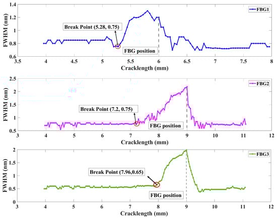 Figure 4 shows the spectral bandwidth extracted from a simulated FBG sensor response. As expected, the FWHM gently varies with the crack propagation and when it approximately contacts the sensors, there would be a sharp increase. In the initiation stage of crack growth, the stress concertation area is distant enough from the location of the FBGs, and the grating senses the uniform strain, which will obtain a single symmetric Gaussian peak and produce a central wavelength shifting. Next, with the crack propagation near the FBGs, the inhomogeneous plastic zone formed ahead of the crack tip will approximately cross the grating, creating spectral distortion and even a primary peak splitting, and the FWHM has an increasing trend. Additionally, the FBGs bonded perpendicular to the crack propagation path would sense the entire plastic zone developed at the crack tip and the inhomogeneous symmetrical strain with gradient. As the applied fatigue loading cycles increase, the plastic zone moves far away from the FBGs, and the elastically strained material behind the crack tip unloads. Thus, the shape of the FBGs reflected spectra trend toward recovery and the FWHM of the FBGs gradually decline. Moreover, it is shown that the fatigue crack damage localization corresponds to the saltation points in the FWHM curve, and the sensitivity distance to crack detection of FBG2 (1.8 mm) is longer than that of FBG1 (0.72 mm) and FBG3 (1.04 mm). This simulation data result shows that the FWHM is an excellent feature for crack location. The complicated experimental data test is discussed in Section 3.