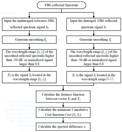 The second proposed damage parameter is the spectral difference based on the dynamic time warping (DTW) method [23]. It is a quantitative indicator to estimate the two series of FBG deformed reflected spectra and healthy reference spectrum for the same sensor. The damage feature is only sensitive to spectral broadening and spectral deformation and ignores the effect caused by central wavelength shifting. The proposed algorithm overcomes the traditional Euclidean-distance definition limitations that are overdependent on central wavelength shifting phenomenon and need to satisfy the same comparative signal lengths requirement. The spectral difference based on the DTW algorithm flow is shown in Figure 5.