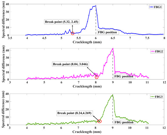 As expected, based on the simulated data, the calculated spectral difference varies with different crack lengths as shown in Figure 6. The spectral difference is a quantitative parameter to present the overlapping degree between measured distorted and healthy reflected spectra for the same sensor. This damage feature shows small fluctuations when the crack is at a far distance from the FBG sensor. Then, a monotonic and rapidly increase appears when the crack propagation distances to FBG1, FBG2, and FBG3 are within 0.68, 0.96, and 0.76 mm, respectively. When the crack grows cross through the sensors, due to the elastically strained material behind the crack tip unloads, the feature accompanying descends with the reflected spectra tending to return to its original state. Through the above analysis, the spectral difference is an excellent feature to estimate whether the crack is located in the monitoring area. Moreover, the 10 mm FBG shows a more border damage detection distance than the 5 mm FBG. The robustness of the feature to the experimental noise strain fields are evaluated in Section 3.