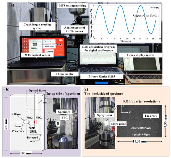 (a) A photo of the test setup; (b) experimental setup of fatigue crack monitoring using an FBG sensor; and (c) experimental setup of the DIC by CCD camera.
