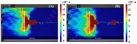 DIC plot of the strain fields around the FBG1 sensor in subfigures (A,B) crack lengths of 5.48 and 5.56 mm.