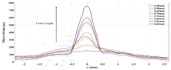 According to previous studies [19], due to the small range of strain inhomogeneity and discontinuity around the crack tip, FBG sensors must be bonded near the crack tip to sense singular stress fields. A 6 mm radial distance from the center hole was selected for placement of the FBG1 sensor (the grating length is 5 mm). The strain along the grating at the FBG1, FBG2 (the grating length is 10 mm), FBG3 (at the same position to FBG2 with 5 mm grating length) sensors under different crack lengths is shown in Figure 2. Additionally, for future strain extractions by the DIC method, the distance between the two sensors should be larger than the crack tip plastic area. The two sensors with different grating lengths and a spacing of 3 mm were bonded at different distances to the crack location to evaluate the robustness of damage features to noise and the damage sensitivity distance of each FBG.