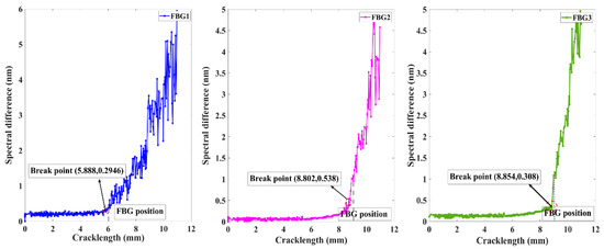 The proposed approach has four key advantages over the previous studies. First, an interpretation of reflected spectrum deformation mechanism with crack propagation were analyzed based on both simulations and experiments. Second, the performance of two potential damage features—FWHM and the spectral difference were proposed and evaluated. Third, the curve of damage features changing with crack propagation presented a significant break point, which corresponds to the moment of crack propagation toward FBG sensors. Fourth, the 10 mm FBG sensor may show superior performance compared to the 5 mm FBG sensor for crack position detection.