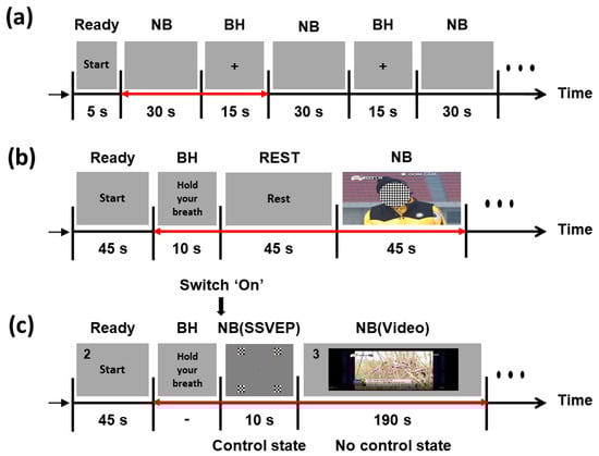 Figure 1a presents a schematic of the offline experiment. At the beginning of the experiment, a brief instruction was presented for 5 s to provide each participant with preparation time. Then, all the participants alternately conducted NB and BH tasks for 30 and 15 s, respectively. They were asked to rest during the NB periods and to hold their breath during the BH periods. During the entire experiment, their body movements were strictly limited to avoid potential movement artifacts. A set of NB and BH periods was repeated 20 times.