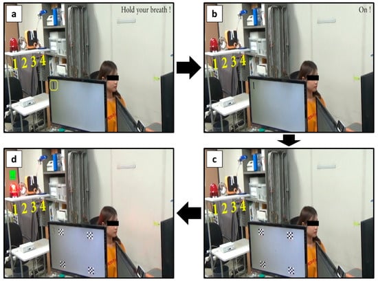 Series of snapshots taken during the online experiment with a healthy participant. (a) Participant held her breath until the PPG-based BCI toggle switch was turned on. (b) Once the PPG switch was turned on, auditory feedback (exclamation of the word “on”) was provided to her. (c) Immediately thereafter, four checkerboard stimuli with different reversing frequencies were presented for 10 s. During this period, she gazed at one of these visual stimuli. (d) After the classification, auditory feedback corresponding to the classification result was provided to her, and simultaneously, one of the environment devices was turned on.