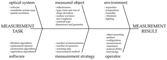 Many factors affect the accuracy of a 3D-structured light scanner. Some of these are listed in the Ishikawa diagram presented in Figure 2. In general, it is rather easy to indicate the potential sources of errors, but estimating the quantitative contribution of each factor to the overall measurement uncertainty and the final uncertainty of a particular 3D scanner is complicated [15,20,34,35,36].