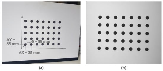 To calibrate the scanner measurement volume, we used a calibration artifact made of a glass plate with a printed pattern Figure 6. The calibration pattern consisted of a matrix of round black markers on a white background. The artifact was validated using the co-ordinate Measuring Machine (CMM) ACCURA 7 by CarlZeiss with the optical scanning probe ViScan [67].