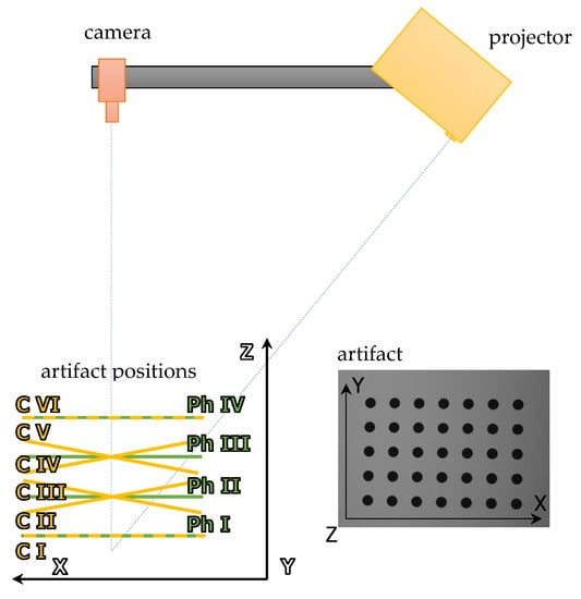 - - For phase calibration, a set of images which represent the absolute phase distribution in at least four different calibration artifact positions (positions Ph I–Ph IV) were captured. Each set of phase images also included a set of images with Gray codes for phase unwrapping.