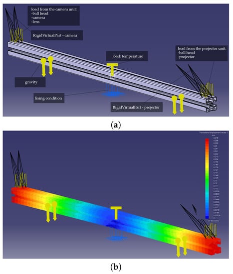 The simulation of the effect of temperature on the mechanical base of a 3D scanner: (a) Simulation definition, loads: from the camera and projector unit mass, temperature, gravity, and two RigidVirtualParts; and (b) the results from the simulation: thermal deformations of the mechanical base.