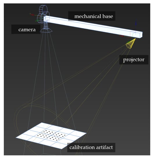 The next step was to create a virtual scanner that can be used to determine the impact of the simulated mechanical base thermal deformations of the deformations of a cloud of points obtained with this scanner. For this purpose, we created a virtual scene in Autodesk 3DsMAX [62] that allowed for advanced rendering with a physical camera. The designed scene was composed of a physical camera (the camera unit) and a physical light source, mapped with a bitmap sequence to project a structured light sequence onto the measurement scene. In the measurement volume, there was also a virtual calibration artifact (Figure 10). The position and orientation and every dimension of the virtual scanner and calibration artifact were approximately the same as the real 3D scanner (Figure 10).