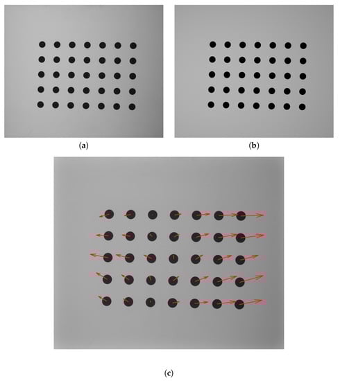 Comparison of the frame captured by the camera and that rendered in the designed virtual scene in 3DsMAX: (a) the actual image of the calibration artifact captured by the camera from the 3D scanner; and (b) the same image rendered in the 3DsMAX environment using the reconstructed geometry of the 3D scanner; (c) a map of marker’s centers shifts (between real and rendered frame) presented by vectors, each vector length was multiplied × 100, and maximum value of shift was no higher than 0.5 px.