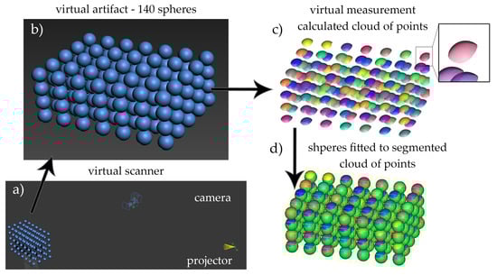 Workflow of the virtual scanner: (a) the virtual validation artifact consisting of 140 balls evenly distributed among the scanner’s measurement volume, (b) the artifact is measured by the virtual scanner, in which the parameters are exactly the same as the real calibrated one, (c) visualization of virtual clouds of points segmentation—different colors, (d) ideal spheres are fitted to each ball segment in the validation artifact.