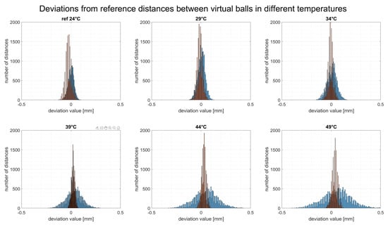 Figure 13 presents the outcome of these calculations—the relative error of all possible distances between each set of 140 virtual balls in six simulated temperatures, in the form of histograms of distance deviations from the reference temperature.