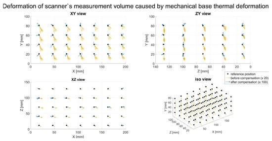Figure 14 shows the directions of the measurement scanner’s volume deformations and the quality of the compensation model. The yellow vectors depict the direction of displacement for every second (for better chart readability) virtual ball’s center before compensation caused by the temperature rise of °C; the length of these vectors were multiplied by 20. The blue vectors represent the same directions after applying the compensation model (the length of each blue vector is multiplied by 100).