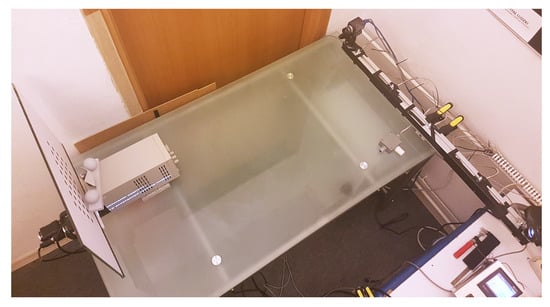The scanner was calibrated in a laboratory, where the temperature of 24 °C was stabilized by an air conditioner approximately 45 min after initialization. The calibrated measuring volume can be described as a cuboid with dimensions mm3 and spatial resolution of mm. To evaluate its uncertainty and estimate the quality of calibration, we used a ball-bar artifact as recommended by VDI/VDE 2634 [32] (Figure 8a). It was built of two ball bearings with a nominal diameter of 40 mm fixed to a marble slab. The ball-bar artifact was validated using a CMM ACCURA 7 by CarlZeiss with the active probe VasGOLD (maximum permissible error for distance measurements for the used CMM was equal to m; maximum permissible scanning error for the used active probe was equal to m).