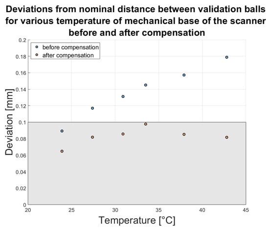 Deviations from the nominal distance between validation balls for various temperatures of the scanner’s mechanical base, before and after compensation. The grey area describes the area where the deviations are no higher than mm.