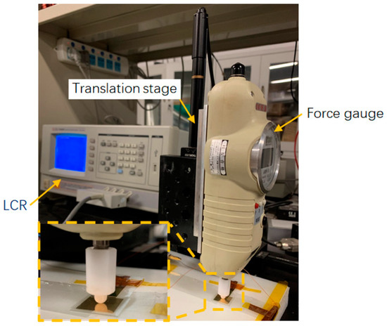 The microstructures of the samples were inspected by a field-emission scanning electron microscopy (SU8010, Hitachi High-Technologies Corporation. Tokyo, Japan) operated at 5 kV. The external pressure was measured by a force gauge (M5-05 MARK-10, Quality Control Solutions, Inc. Temecula, CA, USA) with 0.5 mN resolution. A computer-controlled three-axis translation stage (PT101(M), Thorlabs, Inc. Newton, MA, USA) with 50-nm resolution was used to apply the pressure precisely. The translation stage is driven by direct current (DC) servo motors and the displacement is controlled by a built-in displacement sensor. The displacement of the compression on the pyramids was recorded through the readings of the translation stage. The capacitance was measured using an inductance capacitance and resistance (LCR) meter (TH2828S, Tonghui Electronics, Changzhou, China) with a testing frequency of 1 kHz. The test setup of the sensors is shown in Figure 2.