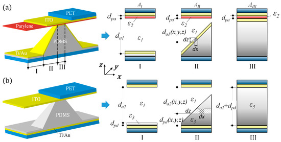 where ε3 is the permittivity of PDMS, da2 the thickness of air dielectric at the blank region I in SMD, dpd the thickness of PDMS layer at the blank region I in SMD, da2(x,y,z) the thickness of air dielectric at the slope region II in SMD, and dpd(x,y,z) the thickness of PDMS at the slope region II in SMD.