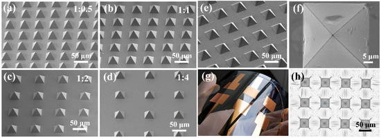 The fabricated PDMS pyramid arrays with different duty ratios from 1:4 to 1:0.5 are shown in Figure 4. The edge length of the pyramid microstructures is 35 μm and the height is 24.7 μm for all of the samples. As shown in Figure 4e,f, a smooth and uniform Ti/Au thin film was coated on the PDMS pyramid structures. Metal thin films deposited on PDMS substrate usually exhibit wrinkles and cracks due to the different thermal expansion rate between metals and PDMS [24,25]. Our experiment also shows that wrinkles occur on the PDMS microstructures (Figure 4h). This problem was solved in our work by bonding a PET substrate with an ITO electrode on the PDMS film during the metal evaporation process. The thermal expansion of the PDMS structure was eliminated by the PET substrate with a lower thermal expansion rate and higher Young’s modulus.